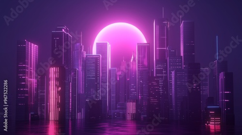 A futuristic cityscape with skyscrapers and tower illuminated by neon lights.
