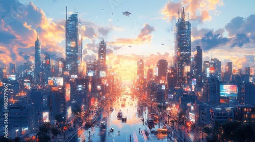 A futuristic cityscape with skyscrapers, neon lights, and flying cars at sunset.