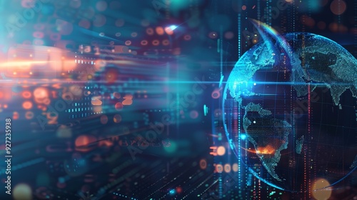 A futuristic depiction of a digital globe, symbolizing global interconnectedness, data flow, technological advancement, innovation, and the digital age.