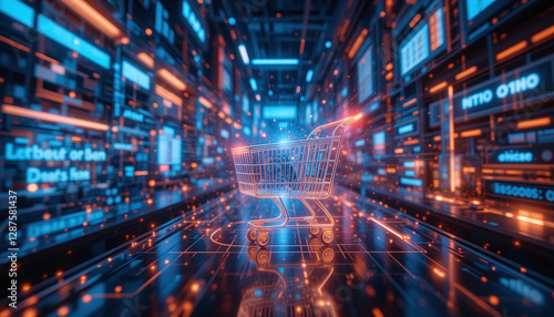 A futuristic digital marketplace with real-time global transactions and a glowing shopping cart concept visualizing seamless online purchases.