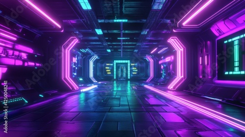 A futuristic gaming space arena with glowing purple, blue and green neon elements, forming an immersive sci-fi environment background wallpaper AI generated image