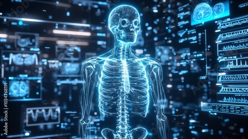 A futuristic holographic display of the human skeletal system, with bones glowing against a dark medical lab background