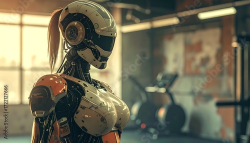 A futuristic humanoid robot stands in a gym setting, wearing sports attire, its design intricate and metallic. Light streams in