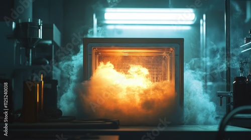 A futuristic metallic box emitting neon-colored smoke into a shadowy laboratory