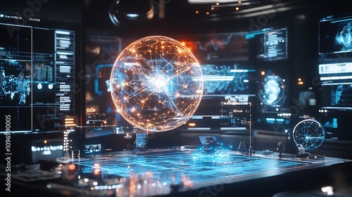 A futuristic physics lab with holographic tools for studying the behavior of exotic particles in high-energy environments