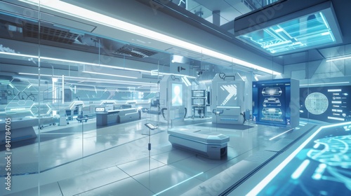 A futuristic recycling plant with holographic displays and advanced sorting technology, set in a clean, high-tech industrial space, highlighting innovation and efficiency.