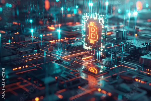 A futuristic representation of bitcoin as a glowing digital currency, floating in a virtual space