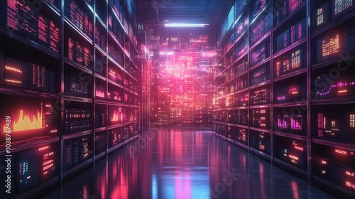 A futuristic server room with glowing screens displaying data and information. The neon lights create a vibrant and dynamic atmosphere.