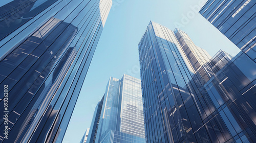 A futuristic skyscraper with a sleek, reflective glass facade rising against a clear blue sky, showcasing modern urban architecture and advanced design