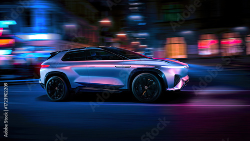 A futuristic SUV driving at high speed against the backdrop of a night city