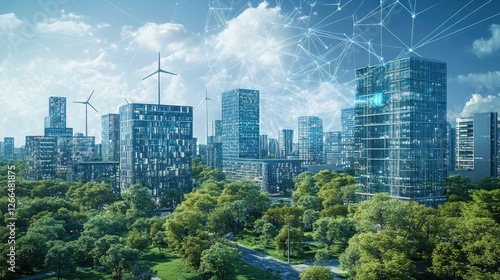A futuristic urban environment seamlessly integrating cybersecurity, AI, and renewable energy sources.