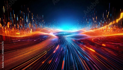 A futuristic wallpaper showing a digital data stream flowing across a dark void