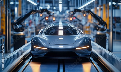 A futuristic-looking sports car is being assembled on a factory production line. Two robotic arms can be seen in the background.