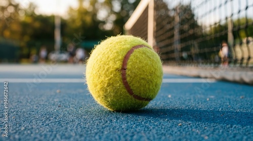 A fuzzy yellow tennis ball sitting on a blue tennis court surface outdoors