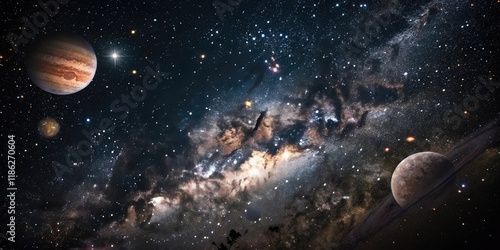 A galaxy of stars and planets floats in the darkness of space, cosmic scenery, extraterrestrial life, spacetime continuum, astronomy