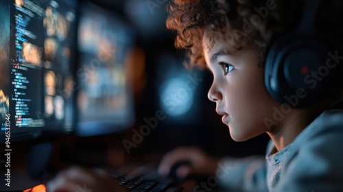A gamer with curly hair wearing headphones, deeply focused on a computer screen, illuminated by the glow of multiple displays in a dark room, capturing intense concentration.