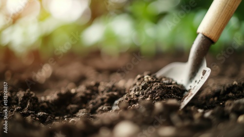 A garden shovel plunged into rich, dark soil, symbolizing growth, potential, and the hard work inherent in cultivating nature's bounty in vibrant, inviting surroundings.