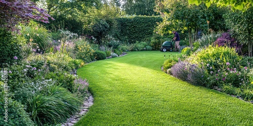A gardener mowing the lawn and trimming edges in a well-maintained garden.