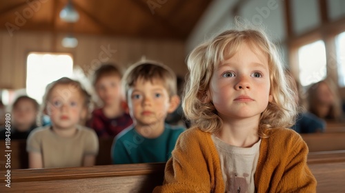 A gathering of children seated in a community space, attentively watching and engaging with their surroundings, capturing the essence of childhood curiosity and community spirit.