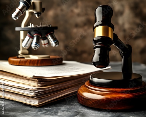A gavel and microscopes on legal documents symbolize the intersection of law and science.