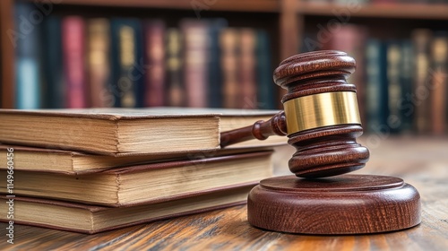 A gavel rests beside stacked law books on a wooden table, symbolizing justice and legal proceedings, Ideal for articles, websites, or presentations related to law, justice, or legal education,