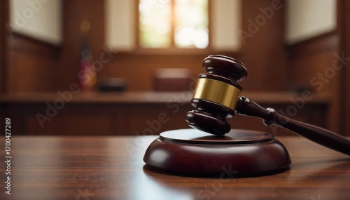 A gavel rests on a wooden judge's bench in a courtroom, symbolizing justice and the legal system The scene is calm and serious, suggesting the gravity of legal proceedings , trial, power, bench