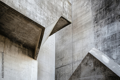 A geometric brutalist background with sharp-edged abstract structures, a cool desaturated color palette, and high-contrast lighting.