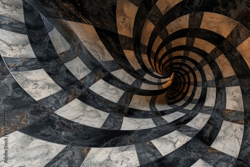 A geometric pattern of black and white spirals adorns a polished marble floor, perfect for use in interior design or architecture visualizations