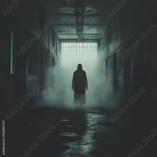 A ghostly figure, cloaked and ominous, stands in the dimly lit corridor of an abandoned asylum, its presence creating an eerie and unsettling atmosphere of mystery and dread within