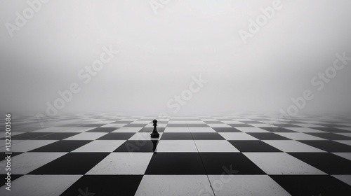 A giant chessboard where the pieces appear larger the closer they get, creating a forced perspective illusion. The black and white tiles seem to stretch infinitely into the horizon. Moody lighting,
