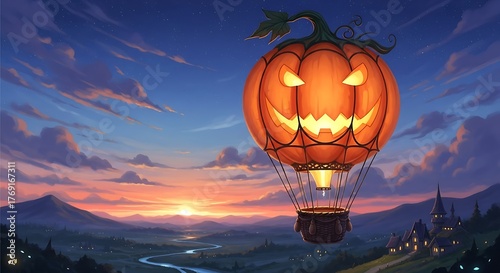 A giant jack-o'-lantern hot air balloon floats over a scenic landscape at sunset, with a castle in the distance.