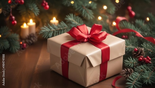 A gift box wrapped in beige paper with a red rib. Shell and fir branch