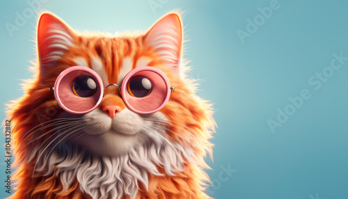 A ginger cat with pink glasses, digital art style, on a blue background, concept of cute and creative. Generative AI