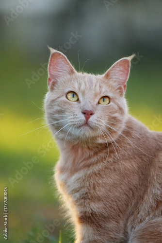 tabby, cat, ginger, sitting, light, gold, warm, evening, shadow, calm, relaxed, pet, animal, felino, environment, background, nature, sunlight, glow, peaceful, mellow, soft, cosy, pose, ear, whisker, tail, fur, detail, expression, head, posture, face, cute, focused, daylight, natural