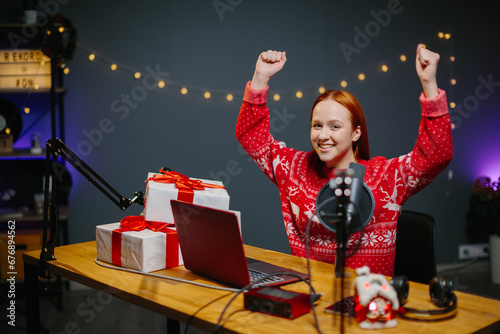 content, new year, gift box, holiday, christmas, woman, blog, communication, guest, station, radio show, living room, monitor, home, laptop, record, streaming, earphones, radio station, mic, studio, professional, speaking, host, talk, recording, man, on air, cyberspace, podcast, earphones, broadcasting, media, audio, live, technology, radio, microphone, entertainment, online