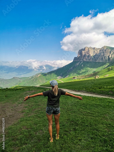 A girl on the background of a green landscape of the Aktoprak pass in the Caucasus. Russia June 2021.