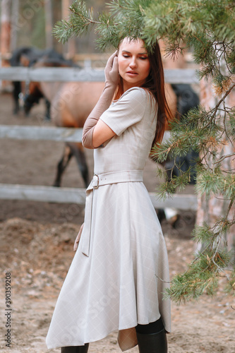 A girl standing next to a horse. Demonstration of clothing by a model