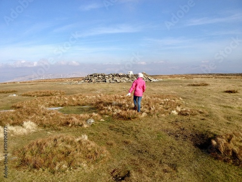 A girl striding towards the pinnacle at the top of a large mountain. The expansive moorland and stone cairns under the bright sky capture the essence of adventure and determination after a long hike.