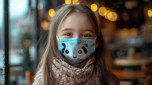A girl wearing a blue mask with a panda pattern, smiling in a cafe. The light from the window makes her face bright and lovely.