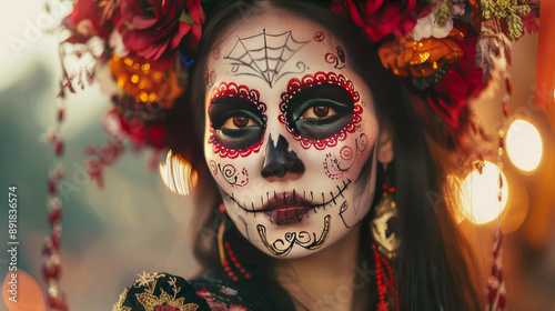A girl with beautiful and scary makeup for the Day of the Dead. This makeup is called Calavera Сatrina. It's like a symbol of this holiday.