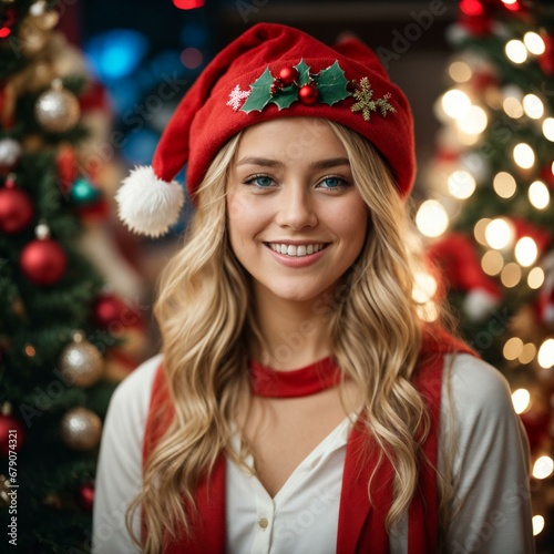 A girl with blonde hair and blue eyes in a red Santa Christmas hat with Christmas tree toys and garlands in the background looks and smiles