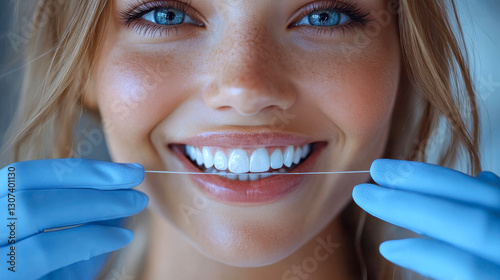 a girl with white teeth carefully brushes her teeth with dental floss. professional home hygiene, dental care