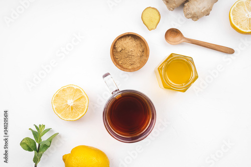 A glass cup of black natural tea with ginger, lemon, mint and honey on wooden white rustic background. Healthy vitamin drink.