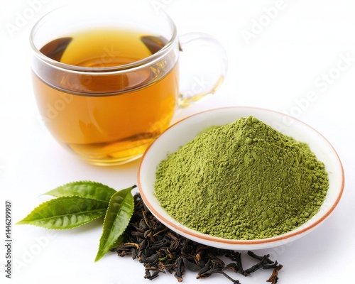 A glass cup of green tea, a bowl of matcha powder, tea leaves, and fresh green leaves on a white background.