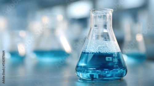 A glass flask filled with blue liquid is placed on a laboratory table. Background displays other glassware used for various chemical experiments in a modern lab environment