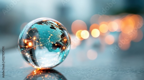 A glass globe with a digital map of the Americas, illuminated by glowing network connections and warm bokeh lights in the background.