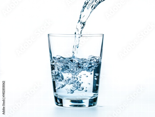 A glass is being filled with clear water, creating ripples and bubbles as it pours in, set against a clean, white background.