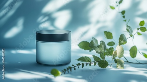 A glass jar of lotion with a black lid sits on a blue surface. Green leaves from a plant are laying on the surface next to the jar. There are shadows cast on the surface.