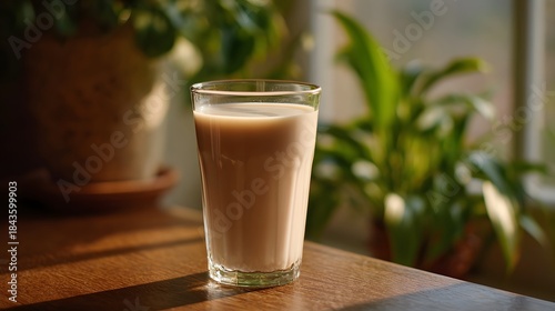 A glass of creamy plant based milk sits on a wooden table bathed in warm morning sunlight beside indoor plants