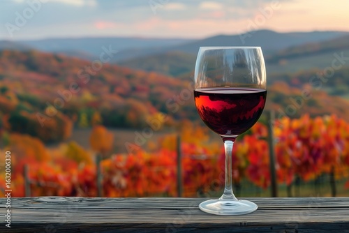 A glass of red wine against a breathtaking autumn vineyard backdrop at sunset.